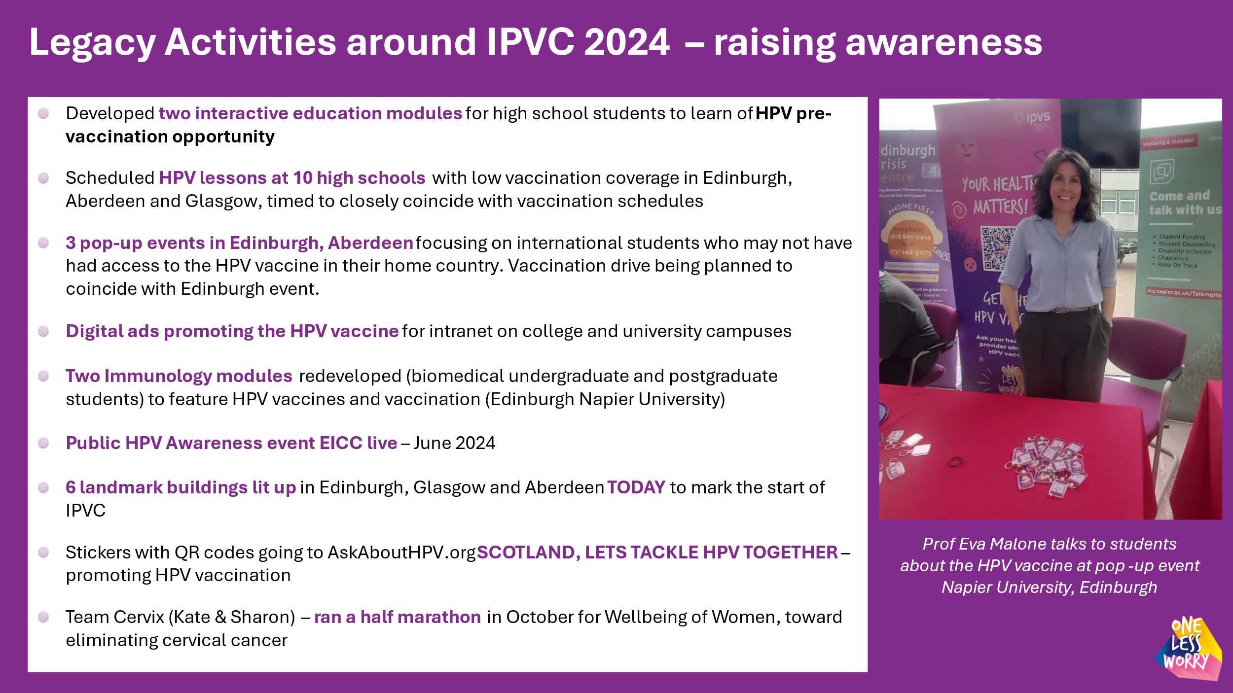 I have worked in the HPV area for 25 years, principally as a clinical scientist within an NHS laboratory setting. Two and a half decades is a long time to work with anything,.. but truthfully, HPV remains perennially interesting to me, perhaps because it interfaces with multiple and diverse disciplines; basic-in vitro research, cancer screening, vaccinology, sexual health, health education, implementation science, oncology, colposcopy/anoscopy and of course…laboratory medicine. The clinical implications of HPV infection also go beyond the cervix and many of the non-cervical cancers with an HPV aetiology are rising (e.g. the oropharynx). In other words, we haven’t solved the “HPV problem” yet. There are still huge gaps in our basic knowledge of this virus and so basic research, enhanced public health interventions and development of clinical services are still very much needed. There remains a thriving HPV research community, internationally and, naturally, scientific meetings are a way to communicate both new findings & share best practice. Having been to several HPV meetings over the years I was honoured (although daunted) to be invited to be one of the local co-chairs of the International Papillomavirus Conference in 2024 (IPVC 2024) in Edinburgh, together with Dr Sharon Hanley (University of Aberdeen) and Prof Sheila Graham (University of Glasgow) – international experts in their respective fields of public health and basic-virology. The IPVC is the official meeting of the International Papillomavirus Society - and there is a society-commitment to ensure the opportunities it provides (1) can raise awareness of HPV in the local communities of the host city/location and (2) can create a programme of “legacy” activities. To this end, a legacy committee was set up one where Sharon, Sheila and I benefitted from the expertise, professionalism and generosity of Prof Eva Malone of Edinburgh Napier University and Ms Gayle McGuinn of the Edinburgh International Conference Centre - which was the conference venue. We also benefited from the support and experience of Ms Chris Amsinger, International HPV Awareness Campaign Officer IPVS and Ms Anita Wiseman IPVS Campaign manager.