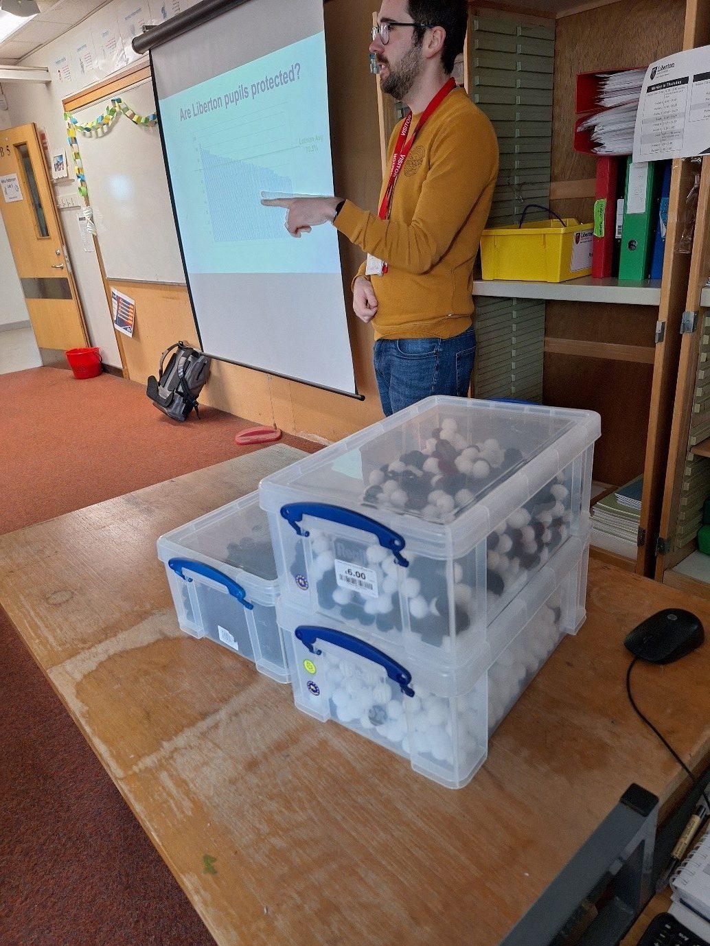 Dom Cairns Gibson – BioQuarter Education and Community Manager at the University of Edinburgh delivering the workshop adjacent to “herd immunity” poms poms.